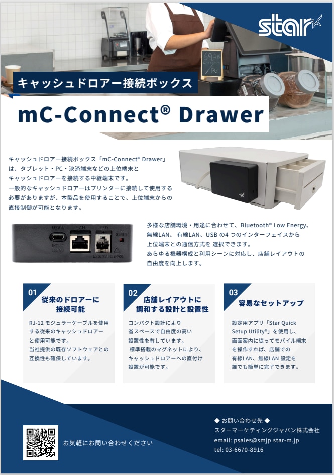 mC-Connect® Drawerはタブレット・PC・決済端末などの上位端末とキャッシュドロアーを接続する中継デバイスです。